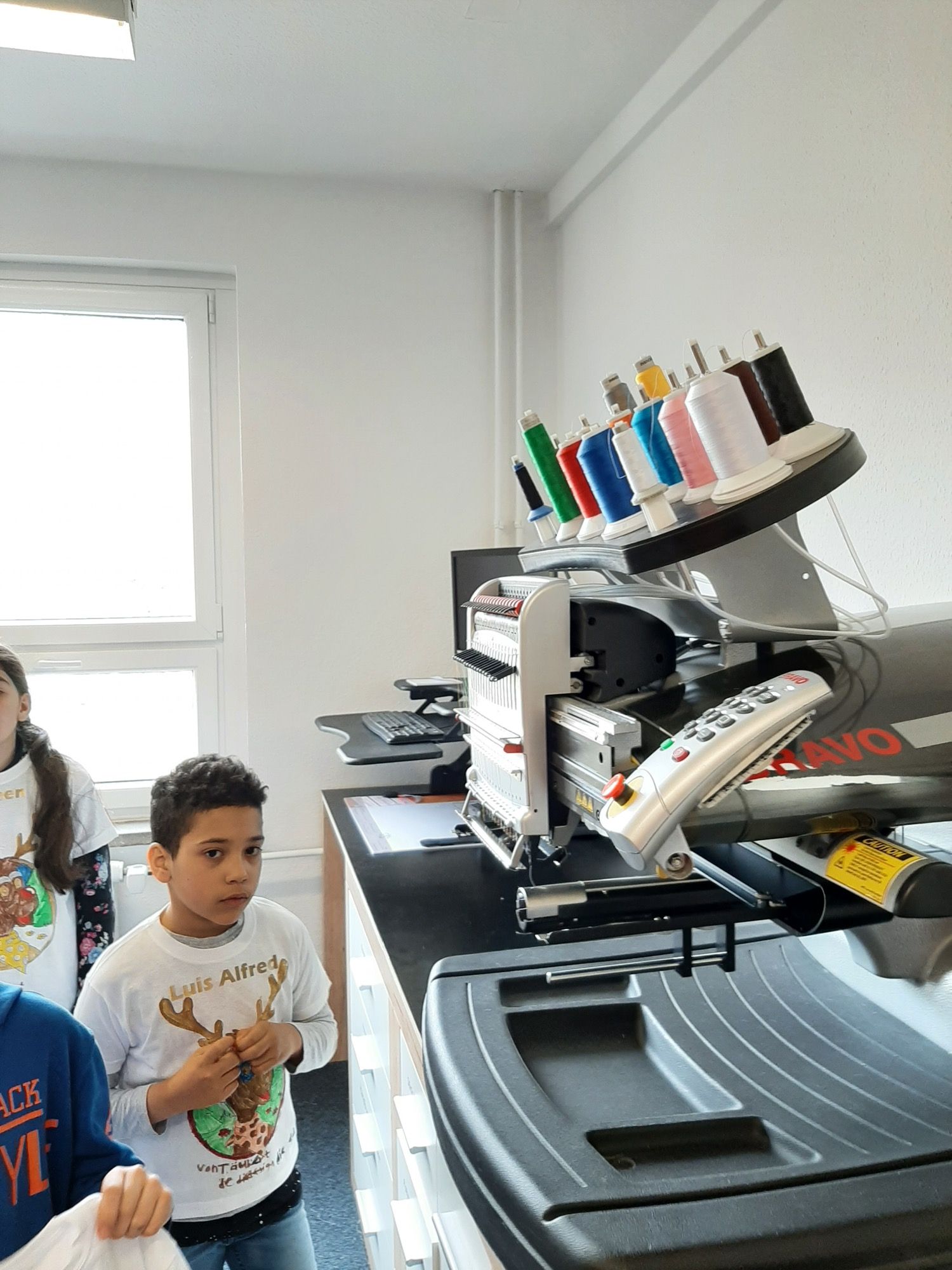 8.30 Uhr, wir betreten das Gebäude und werden von Katja Pense und den Azubis schon herzlich empfangen. Frau Pense hat uns erklärt, was hier alles gemacht wird. Das sind nicht nur Plakate, sondern auch riesige Folien für Autos, Busse und Anziehsachen für Firmen werden auch bestickt. Wir kommen aus dem Staunen nicht mehr raus. Die drei Azubis zeigen uns bei einem Rundgang durch das gesamte Gebäude alles genau.