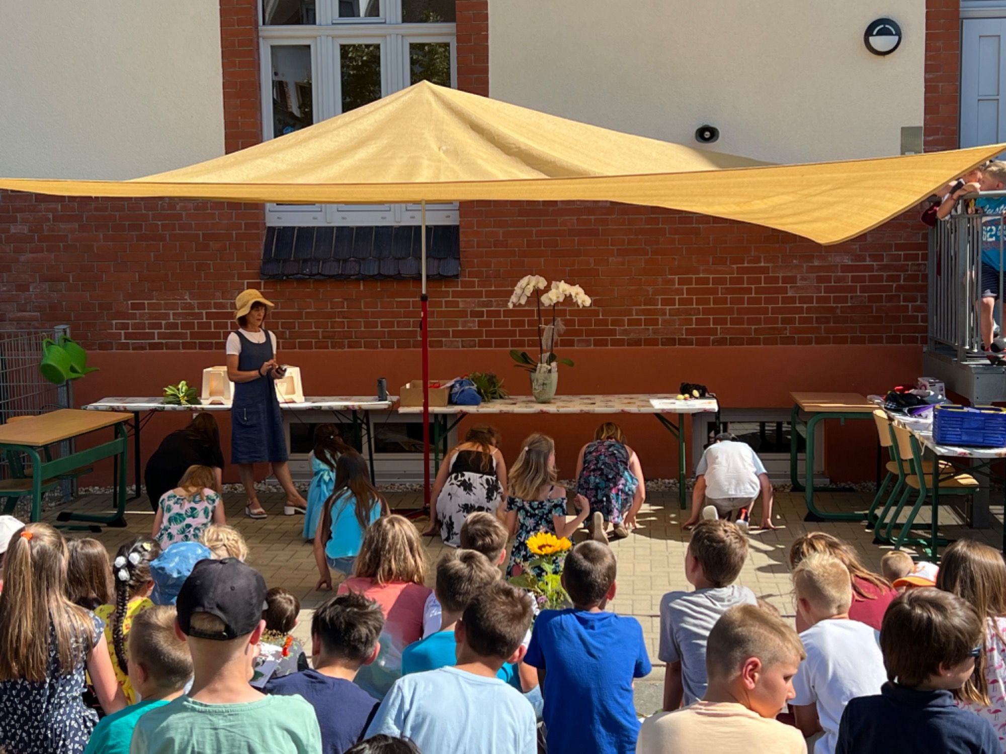 Wir sagen ganz herzlich Dankeschön an Familie Lippert. Sie hat uns Nistkästen und Insektenhotels gesponsert. Diese haben wir, die Kids der Klassen 1, im Sorgwald und auf unserem Schulgelände aufgehängt. Jetzt haben viele Vögel die Möglichkeit, in Ruhe zu brüten. Viele kleine Insekten werden sich an den Insektenhotels erfreuen.